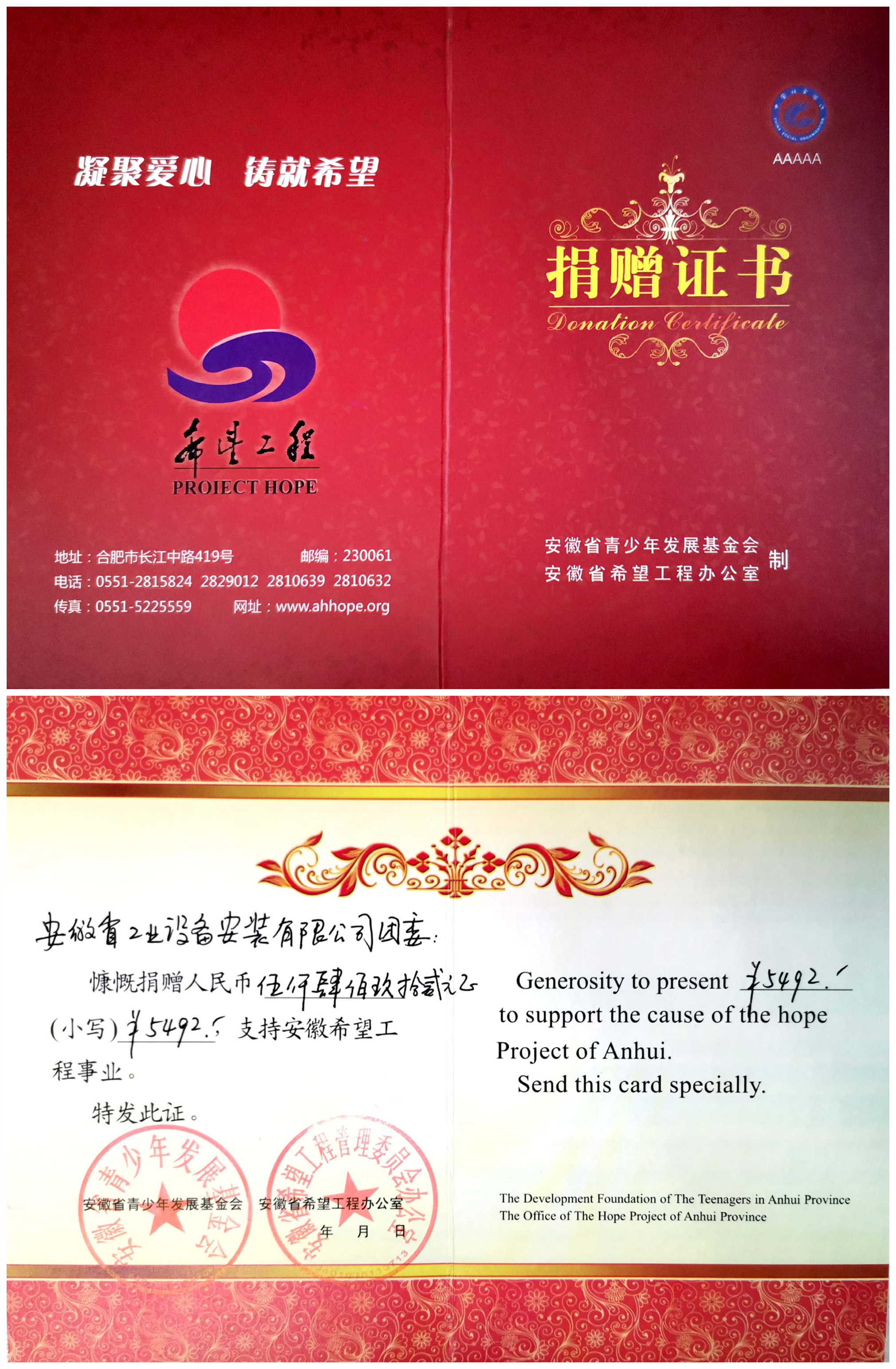 今年的3月5日是第57個(gè)“學(xué)雷鋒紀(jì)念日”。近日,安徽安裝公司團(tuán)委組織開(kāi)展了愛(ài)心捐款活動(dòng)。此次捐款得到廣大團(tuán)員青年熱烈響應(yīng),共收到捐款5492元,目前已全部捐贈(zèng)至安徽省青少年發(fā)展基金會(huì)。