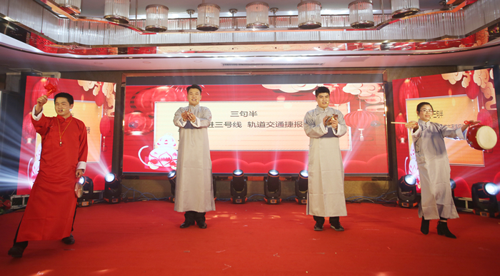 整場聯(lián)歡會由歌伴舞、朗誦、合唱、小品、樂器演奏、三句半、黃梅戲、音詩畫等16個節(jié)目組成,均為職工自編自導自演。在歌伴舞《今天是你的生日中》中,聯(lián)歡會正式拉開序幕?!妒“操潯芬愿木幇纥S梅戲劇的形式為公司送上美好的祝愿;配樂詩朗誦《春風浩蕩啟新程,揚帆起航再出發(fā)》展現(xiàn)了安徽安裝人團結(jié)奮進,一往無前的精神風貌;三句半《拼搏奮進三號線,軌道交通捷報傳》以幽默的方式講述了軌道交通3號線合肥大劇院站項目部上的故事;音詩畫《奮斗是青春最亮麗的底色》講述了新疆烏蘇管廊、中水回用項目榮獲“安徽省工人先鋒號”背后的故事,向全體奮戰(zhàn)在項目施工一線的安徽安裝人致敬...歡快的旋律,優(yōu)美的舞姿,幽默的小品,豪邁的朗誦將現(xiàn)場的氣氛推向高潮,贏得了現(xiàn)場觀眾的歡呼喝彩與陣陣掌聲。