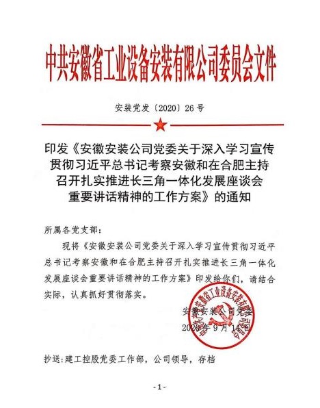 一是公司黨委迅速嚴密部署學習宣傳貫徹各項工作。9月8日,公司黨委理論中心組率先帶頭,認真學習重要講話精神,深刻交流研討。9月14日,安徽安裝公司黨委下發(fā)《關于深入學習宣傳貫徹習近平總書記考察安徽和在合肥主持召開扎實推進長三角一體化發(fā)展座談會重要講話精神的工作方案》,結合公司實際,精心嚴密部署“大學習”“大宣傳”“大貫徹”和“大落實”工作,確保公司上下人人都學習,人人都領會。