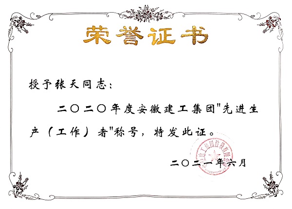 2017年5月,張?zhí)焱靖鶕?jù)工作需要遠(yuǎn)赴新疆烏蘇項(xiàng)目上,在不到兩年的時(shí)間內(nèi),嚴(yán)謹(jǐn)求實(shí),勤奮刻苦,兢兢業(yè)業(yè),時(shí)時(shí)處處嚴(yán)格要求自己,始終以飽滿(mǎn)的工作熱情、扎實(shí)的工作作風(fēng)、優(yōu)異的工作成績(jī),贏得了廣大員工的普遍好評(píng),榮獲2020年“建工集團(tuán)年度先進(jìn)生產(chǎn)(工作)者”稱(chēng)號(hào)。