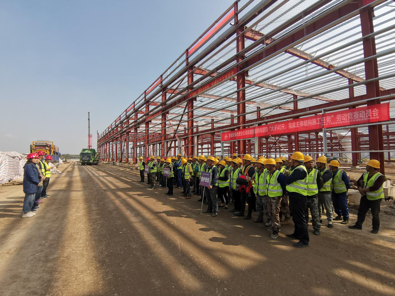 為貫徹落實(shí)集團(tuán)公司“學(xué)黨史、保安康、搶工期、爭一流、沖千億”勞動(dòng)競賽活動(dòng)精神,10月29日上午,安徽安裝合肥分公司建工智能鋼構(gòu)項(xiàng)目舉行“大干40天,完成主次構(gòu)施工任務(wù)”勞動(dòng)競賽動(dòng)員會(huì),公司紀(jì)委副書記、工會(huì)副主席王敏出席,合肥分公司副經(jīng)理夏國祥、工會(huì)副主席杜瓊、項(xiàng)目管理人員及勞務(wù)班組參加會(huì)議。