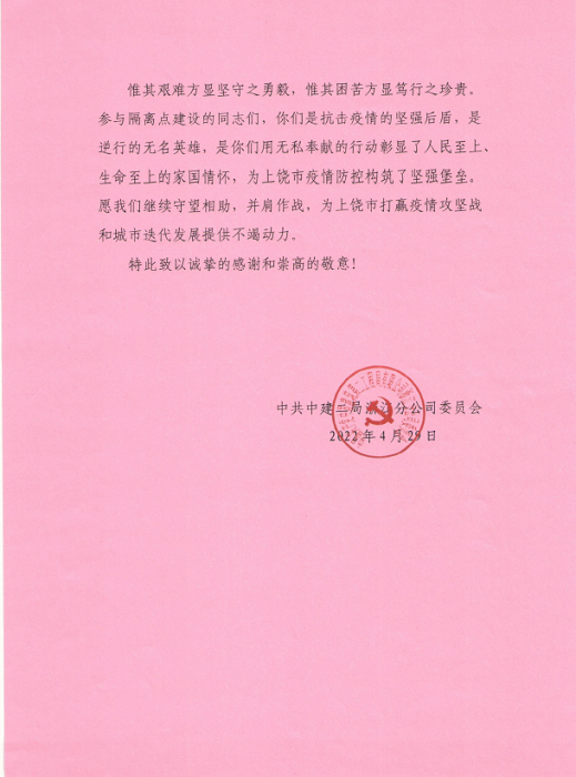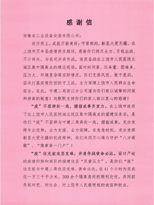 信中對安徽安裝公司與中建二局浙江分公司共同援建上饒市人民醫(yī)院北城區(qū)集中隔離點(diǎn)給予高度的肯定和認(rèn)可。當(dāng)前,新冠疫情形勢嚴(yán)峻,安徽安裝公司在嚴(yán)格落實(shí)屬地疫情防控措施的同時(shí),一方面積極參與本地區(qū)隔離點(diǎn)、醫(yī)院發(fā)熱門診的緊急建設(shè)任務(wù);另一方面攜手相關(guān)行業(yè)兄弟單位同心協(xié)力、援建市外防疫區(qū)域,承擔(dān)起國有企業(yè)社會(huì)責(zé)任,竭盡所能地為防疫建設(shè)貢獻(xiàn)最大的力量!