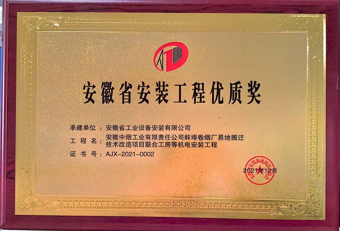 近日,安徽省安裝和機械設備協(xié)會第八屆會員代表大會在合肥順利召開,會議頒發(fā)了“2021-2022年安徽省安裝工程優(yōu)質(zhì)獎”,我單位承建的安徽省中煙工業(yè)有限責任公司蚌埠卷煙廠易地搬遷技術(shù)改造項目聯(lián)合工房等機電安裝工程、康寧藥用硼硅玻璃管廠房設施建設工程(安裝工程)分別榮獲2021年度“安徽省安裝工程優(yōu)質(zhì)獎”、2022年度“安徽省安裝工程優(yōu)質(zhì)獎”榮譽稱號。