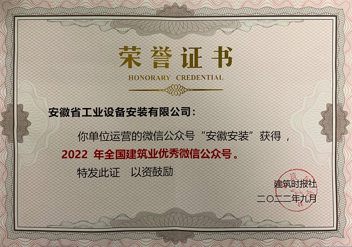 9月25日,由建筑時報社主辦的2022年建筑業(yè)微信公眾號運維經(jīng)驗交流研討會暨全國建筑業(yè)優(yōu)秀微信公眾號頒獎典禮在武漢召開。公司微信公眾號“安徽安裝”榮獲“2022年全國建筑業(yè)優(yōu)秀微信公眾號”榮譽。