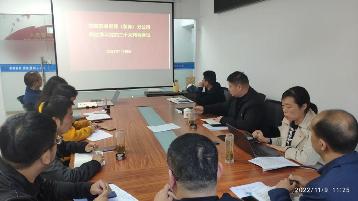 11月9日上午,房建(裝飾)分公司黨支部組織全體黨員、機關(guān)干部職工、在肥項目經(jīng)理召開學習宣貫黨的二十大精神專題會議。會議由支部書記程茂麗主持。