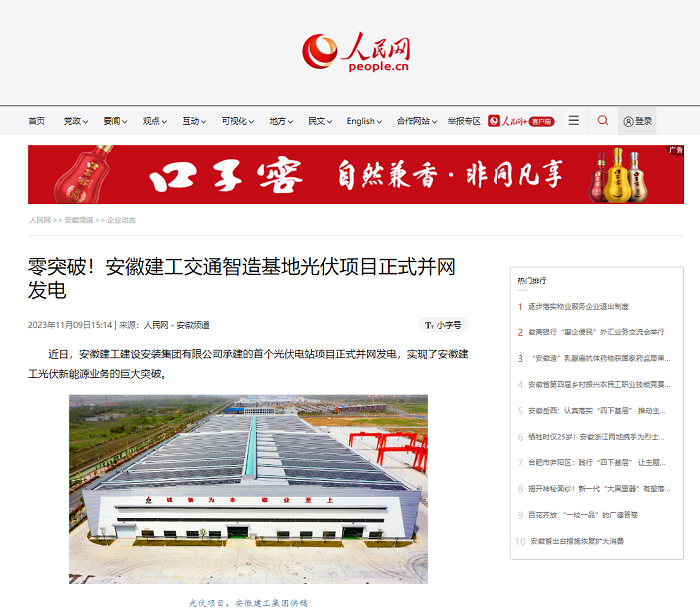 近日,人民網(wǎng)專(zhuān)題報(bào)道公司承建的首個(gè)光伏電站項(xiàng)目正式并網(wǎng)發(fā)電,實(shí)現(xiàn)了安徽建工光伏新能源業(yè)務(wù)的巨大突破。