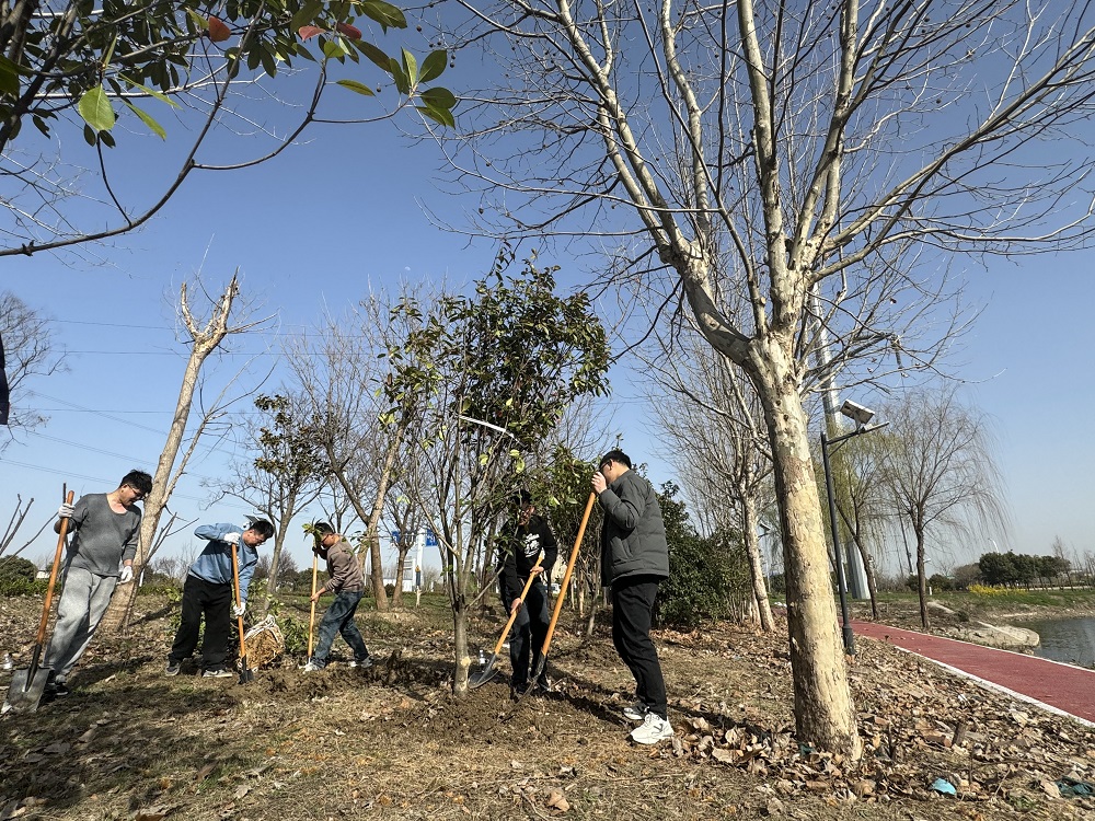 植樹現(xiàn)場,團員青年們熱情高漲、干勁十足。大家通力協(xié)作、揮鍬鏟土、踏土夯苗、提水澆灌,忙的不亦樂乎。經(jīng)過一番辛勤勞動,多株翠綠的樹苗迎風而立,一片勃勃生機的景象,為河岸再添新綠。