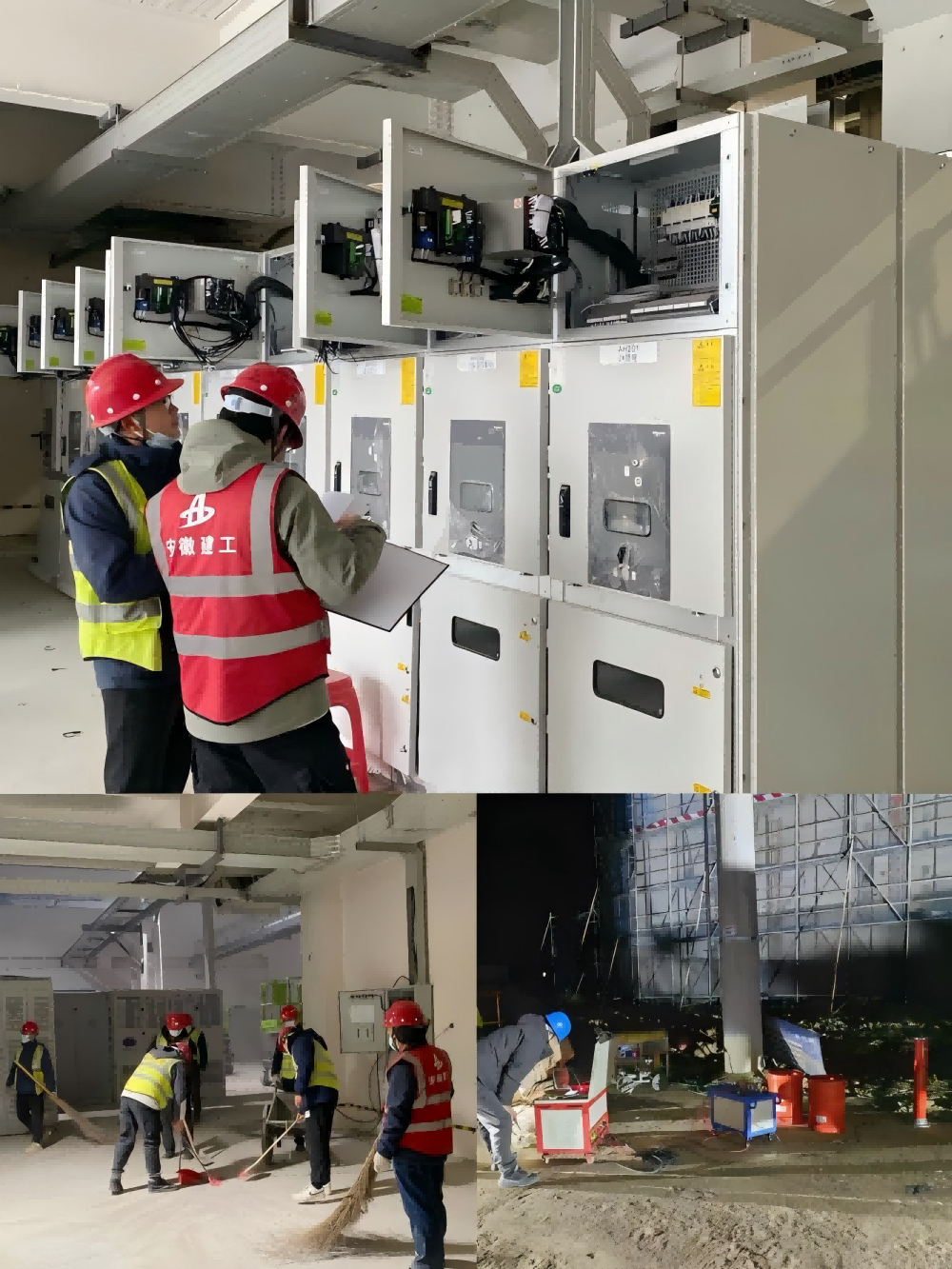 圖為新橋智能制造產(chǎn)業(yè)園機(jī)電安裝項(xiàng)目高壓柜二次接線核對(duì)、外線電纜耐壓試驗(yàn)、配電房衛(wèi)生打掃