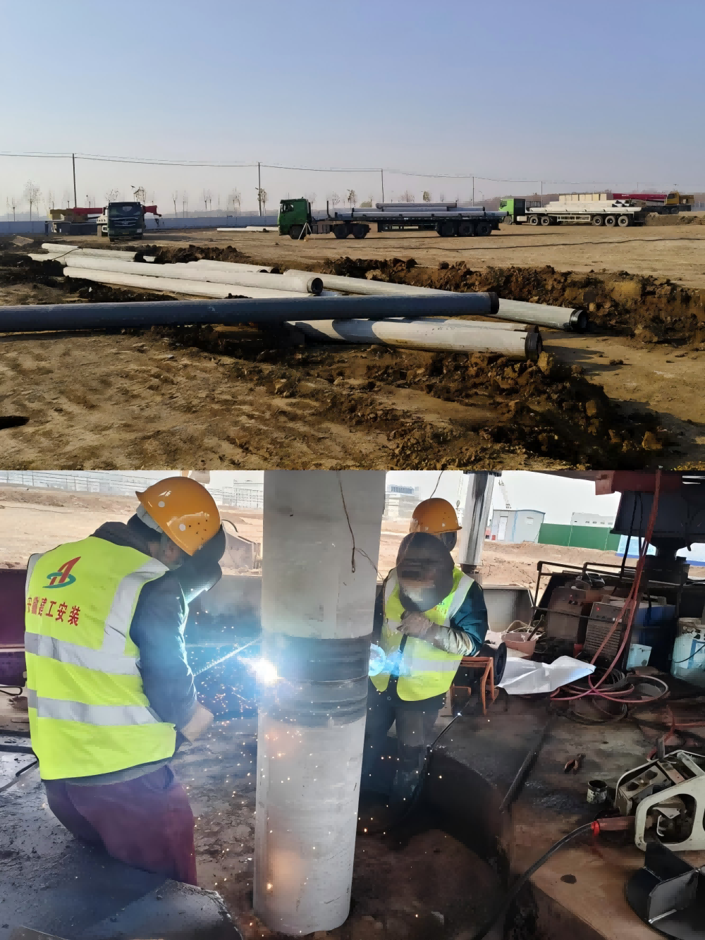 圖為明光涂料、防水材料及配套原料等產(chǎn)品智能化基地一期項(xiàng)目管樁原材料進(jìn)場(chǎng)、焊接管樁