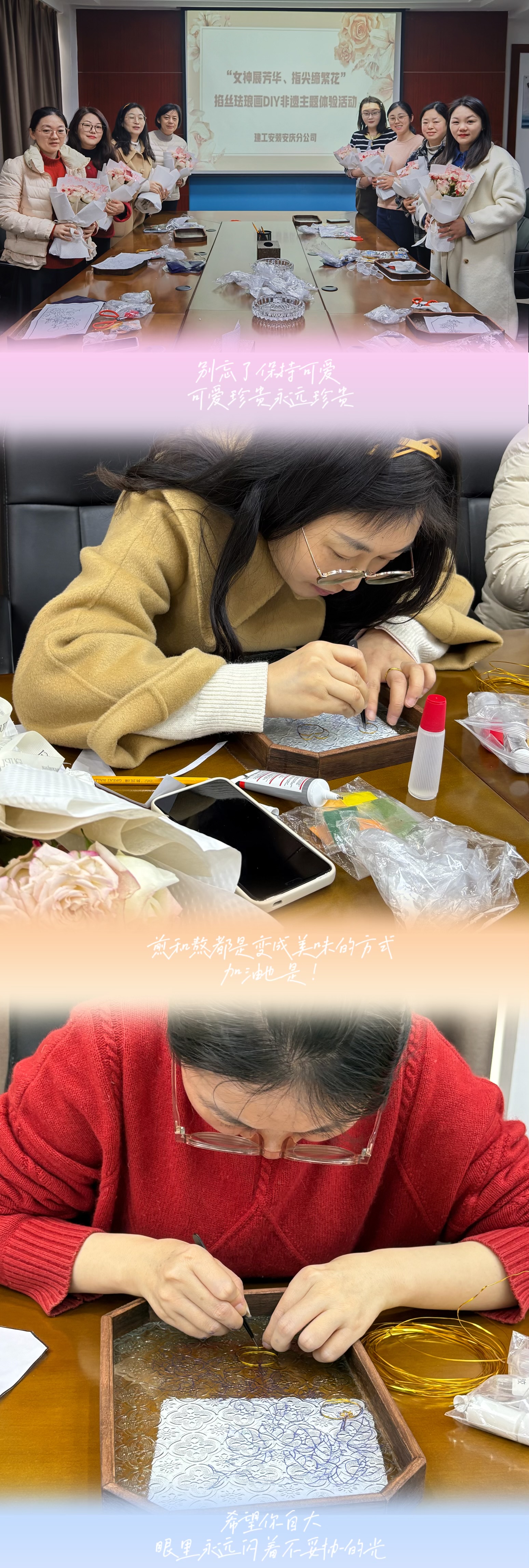 一年一度春風(fēng)暖,如詩如畫三月天。在第115個“三八”國際勞動婦女節(jié)來臨之際,為豐富女職工的文化生活,激發(fā)女職工干事創(chuàng)業(yè)的工作熱情,增強女性職工歸屬感、幸福感,建工安裝安慶分公司于3月7日開展“女神展芳華、指尖締繁花”掐絲琺瑯畫DIY非遺主題體驗活動,讓大家感受傳統(tǒng)文化魅力和工匠精神。