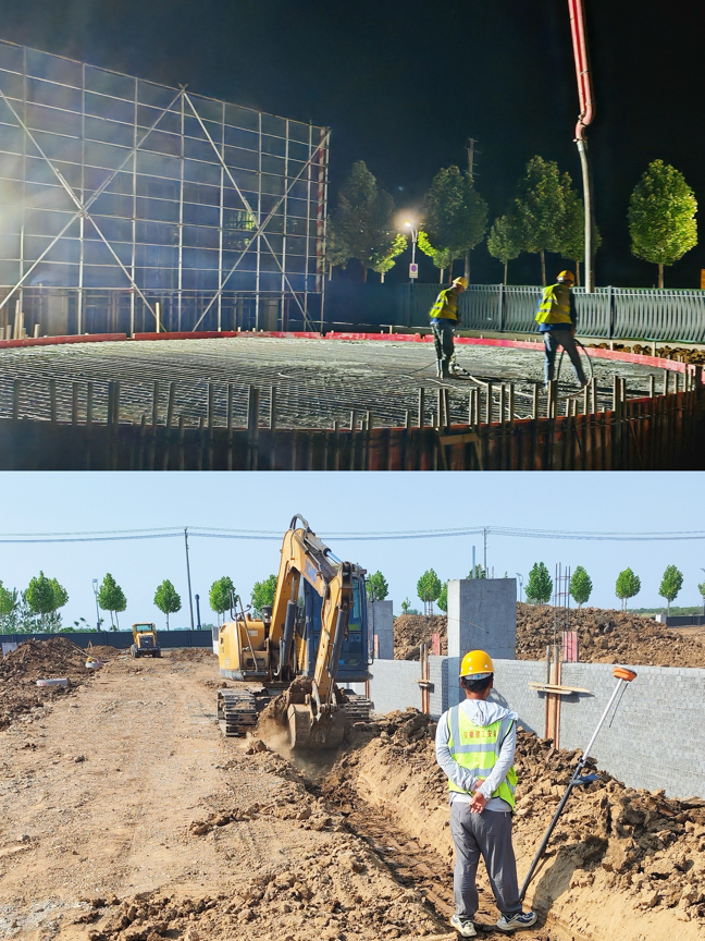 圖為明光科順涂料智能化生產(chǎn)基地項(xiàng)目筏板基礎(chǔ)混凝土澆筑、管道溝槽開挖
