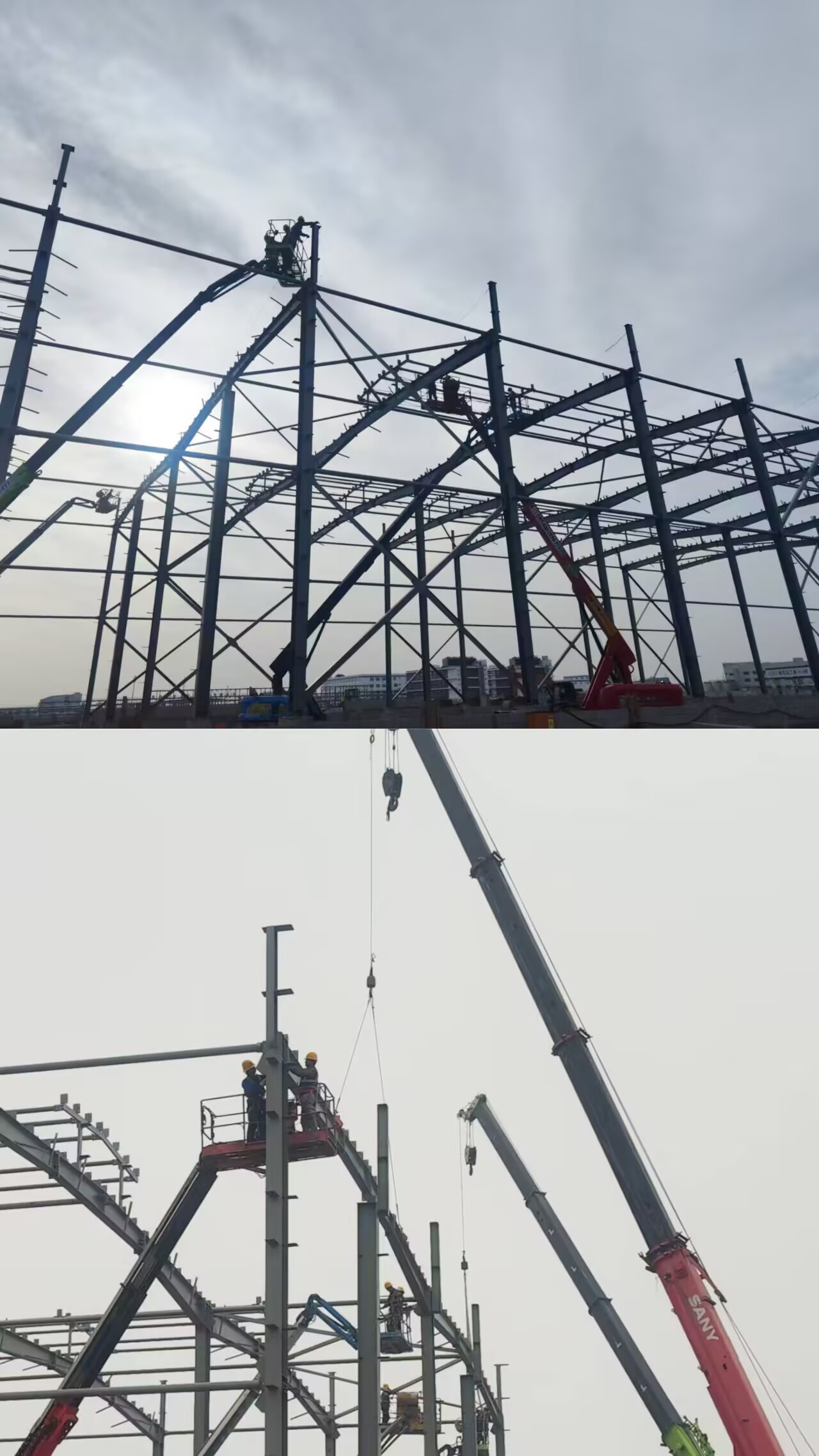 走進(jìn)項(xiàng)目施工現(xiàn)場(chǎng),起重機(jī)揮動(dòng)著粗壯的鋼鐵臂膀劃破天際,將一段段鋼梁精準(zhǔn)的吊裝至安裝位,曲臂車(chē)托舉著工人將鋼構(gòu)件嵌入到預(yù)定位置,保障高空作業(yè)人員的生命安全。這是力量與技術(shù)的二重奏,更是安全與效率的完美平衡,一幅現(xiàn)代工業(yè)建筑的壯美畫(huà)卷正徐徐展開(kāi)。